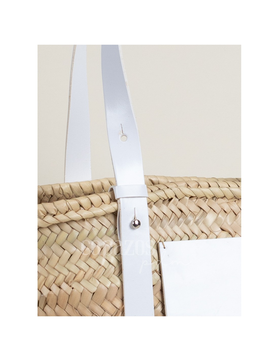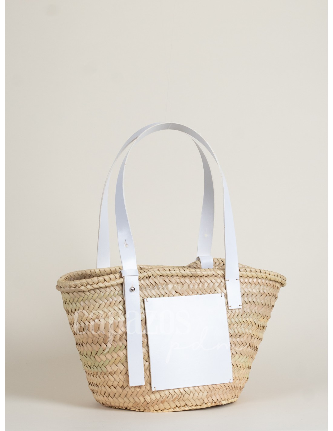 Capazo tejido a mano con palma natural y asas de hombro de piel cosidas a mano y chapón grande con posibilidad de personalización.