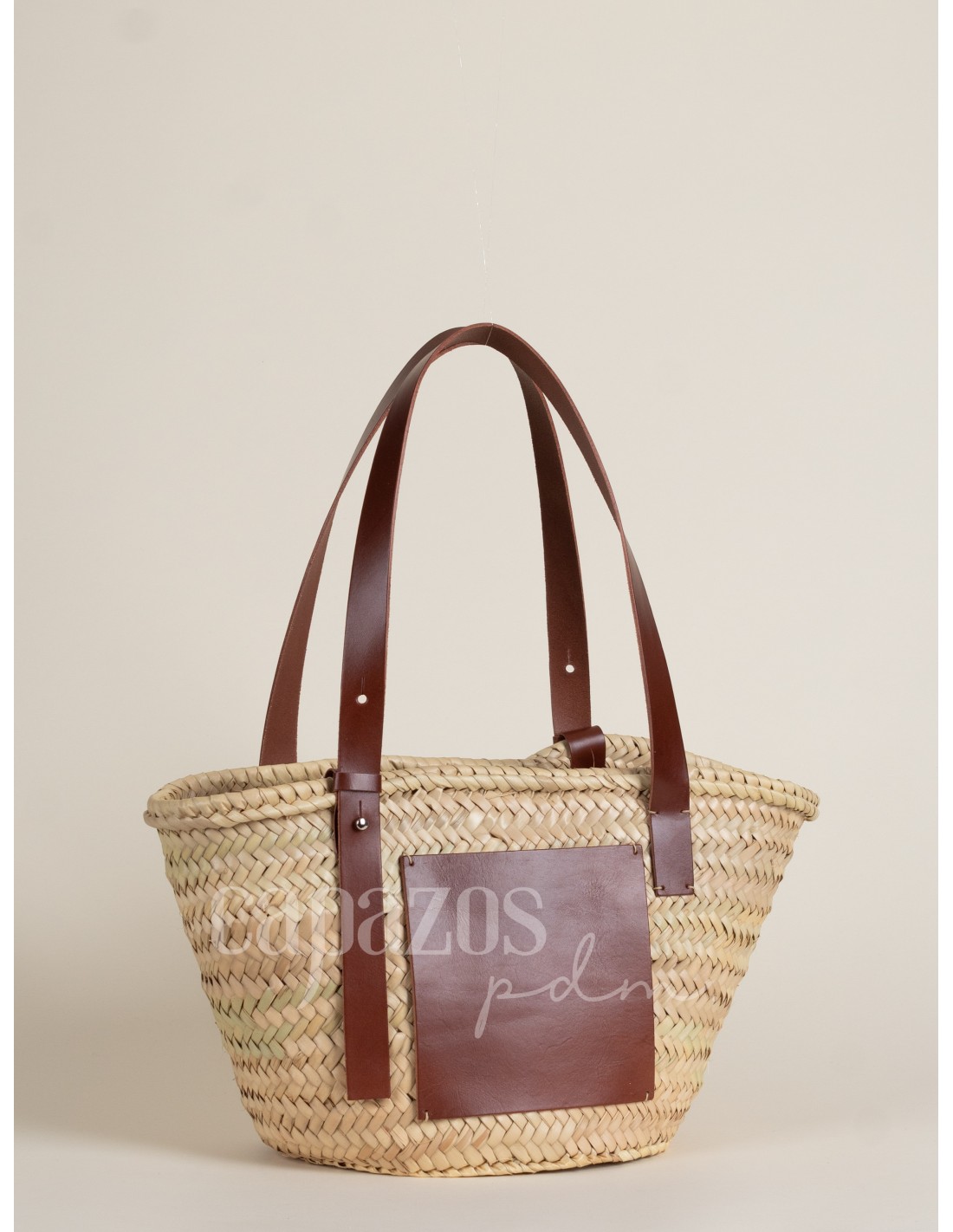 Capazo tejido a mano con palma natural y asas de hombro de piel cosidas a mano y chapón grande con posibilidad de personalización.