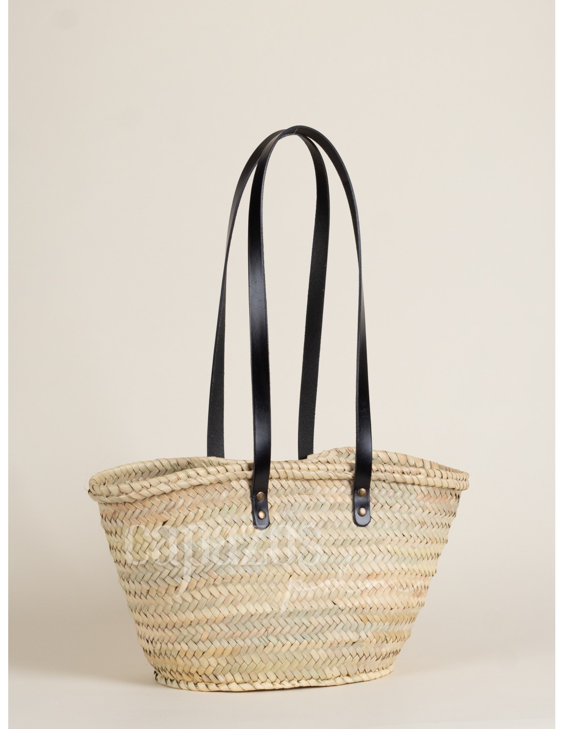 Capazo tejido a mano con palma natural y asas de hombro en piel de vaquetilla. Las asas son de 85x1.7 cm.