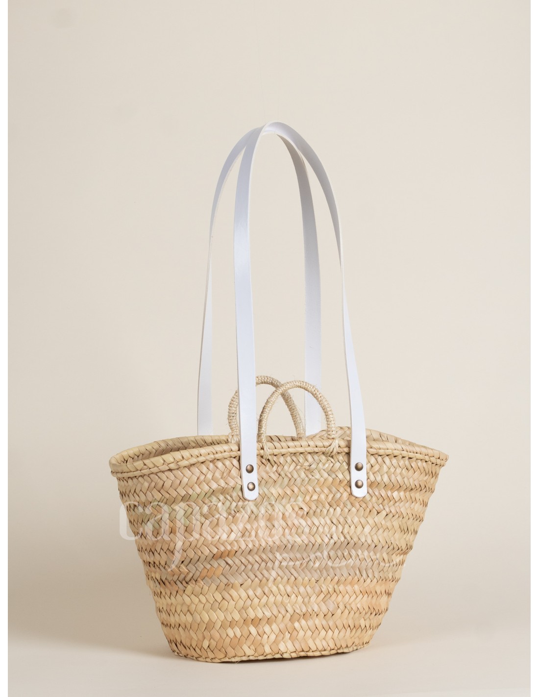 Capazo tejido a mano con palma natural y asas de hombro en piel de vaquetilla y asas de mano de pita de fibra vegetal. Las asas de piel son de 85x1.7 cm.