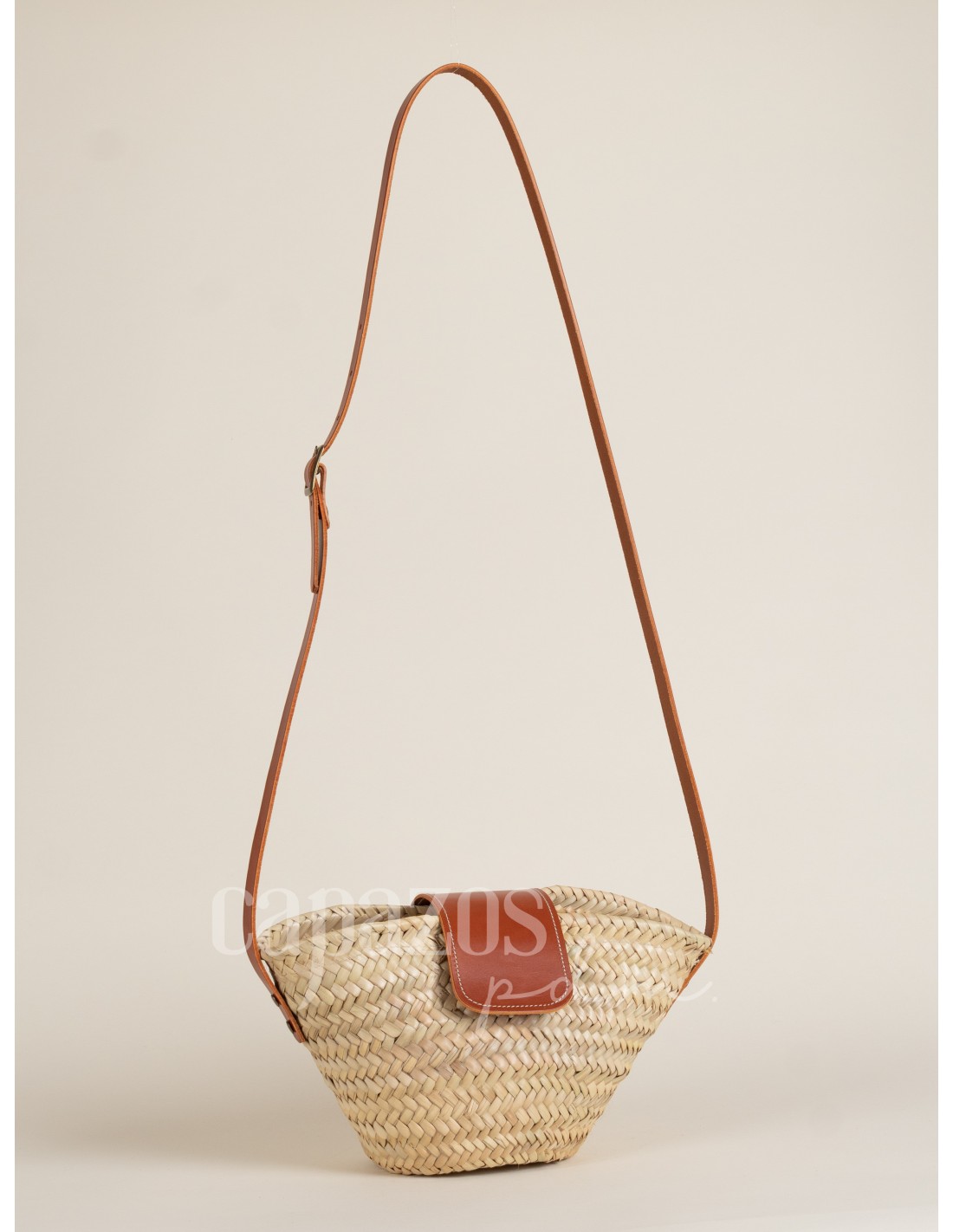 Capazo cerrado con cremallera, tejido con palma natural y asa de cruzar en piel con hebilla para regular, con posibilidad de personalización. La solapa de piel va pespunteada con hilo beige y cerrada con imán.