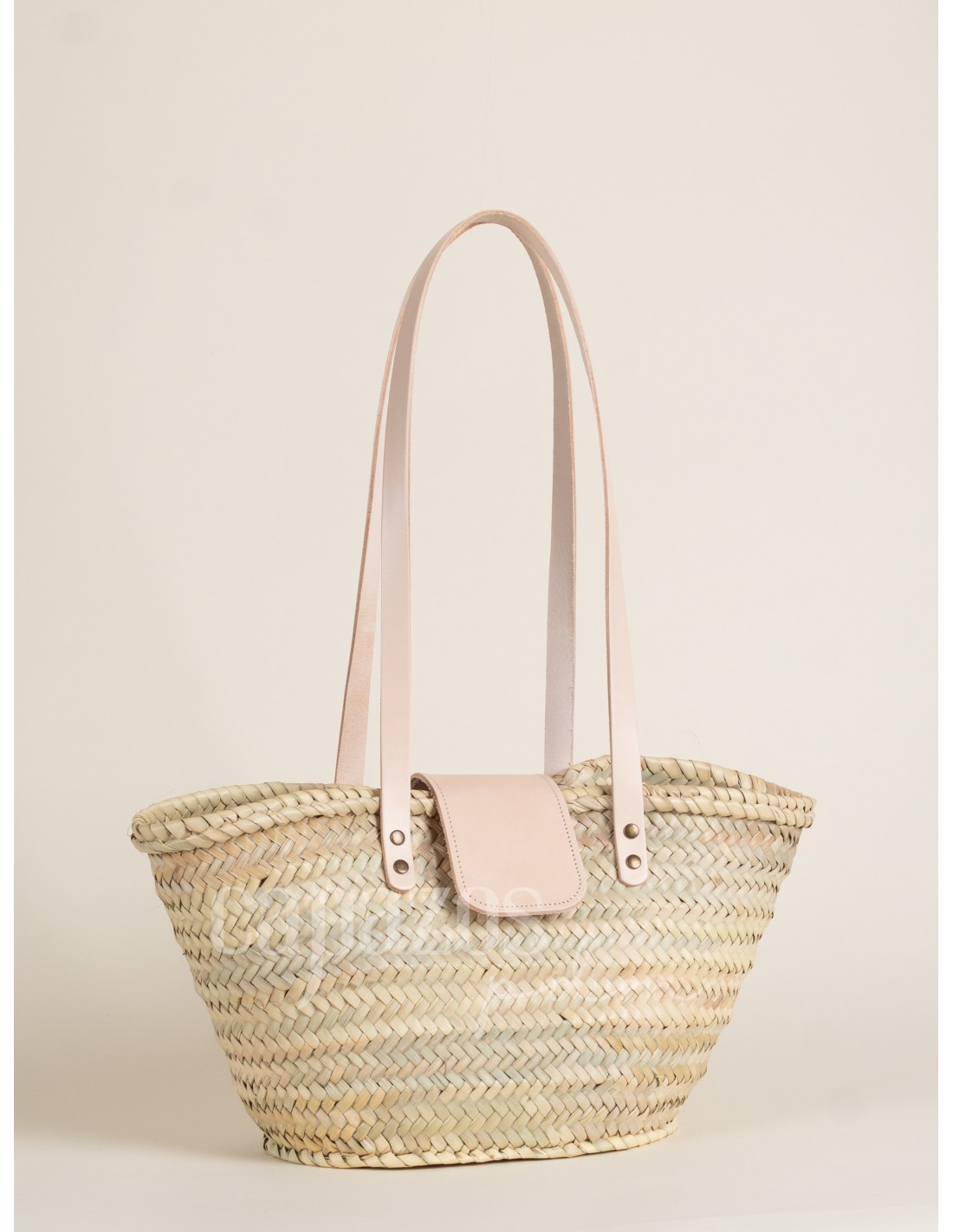 Capazo cerrado con cremallera, tejido con palma natural y asa de hombro en piel, con posibilidad de personalización. La solapa de piel va pespunteada con hilo beige y cerrada con imán.
