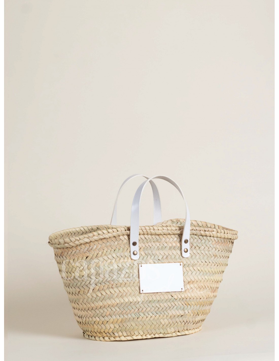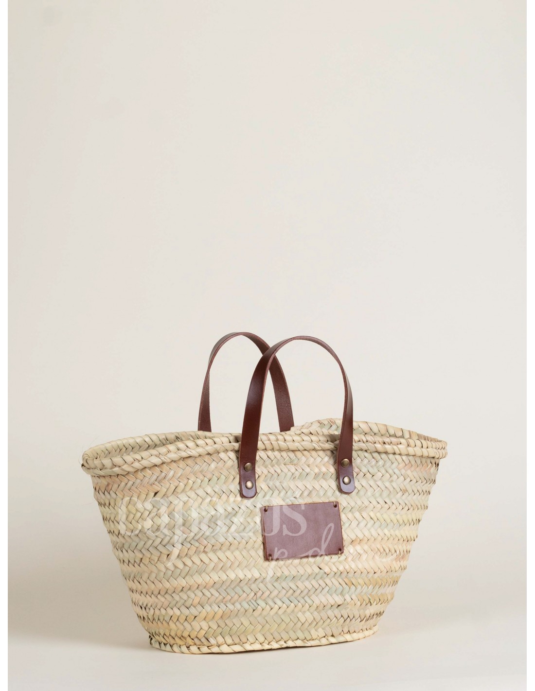 Capazo tejido a mano con palma natural y asas de mano en piel de vaquetilla, con posibilidad de personalización.