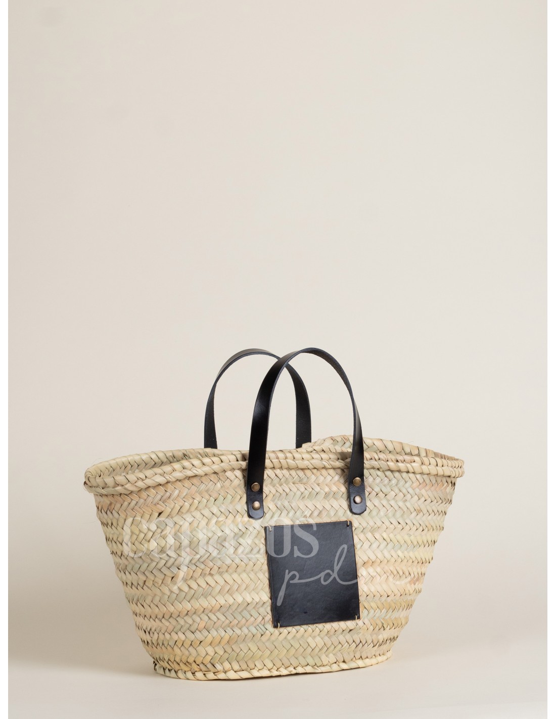 Capazo tejido a mano con palma natural y asas de mano en piel de vaquetilla, con posibilidad de personalización.