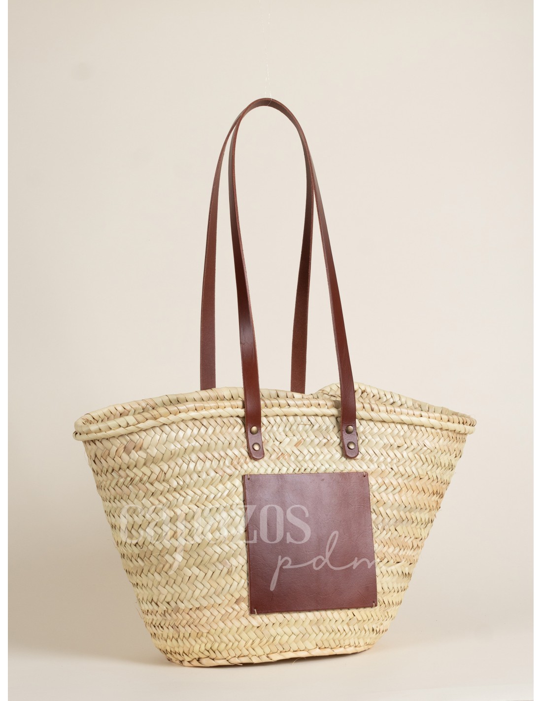 Capazo tejido a mano con palma natural y asas de hombro en piel de vaquetilla, con posibilidad de personalización.