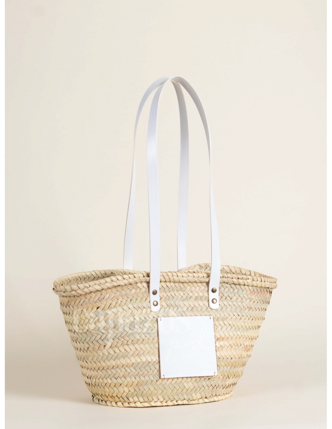 Capazo tejido a mano con palma natural y asas de hombro en piel de vaquetilla, con posibilidad de personalización.