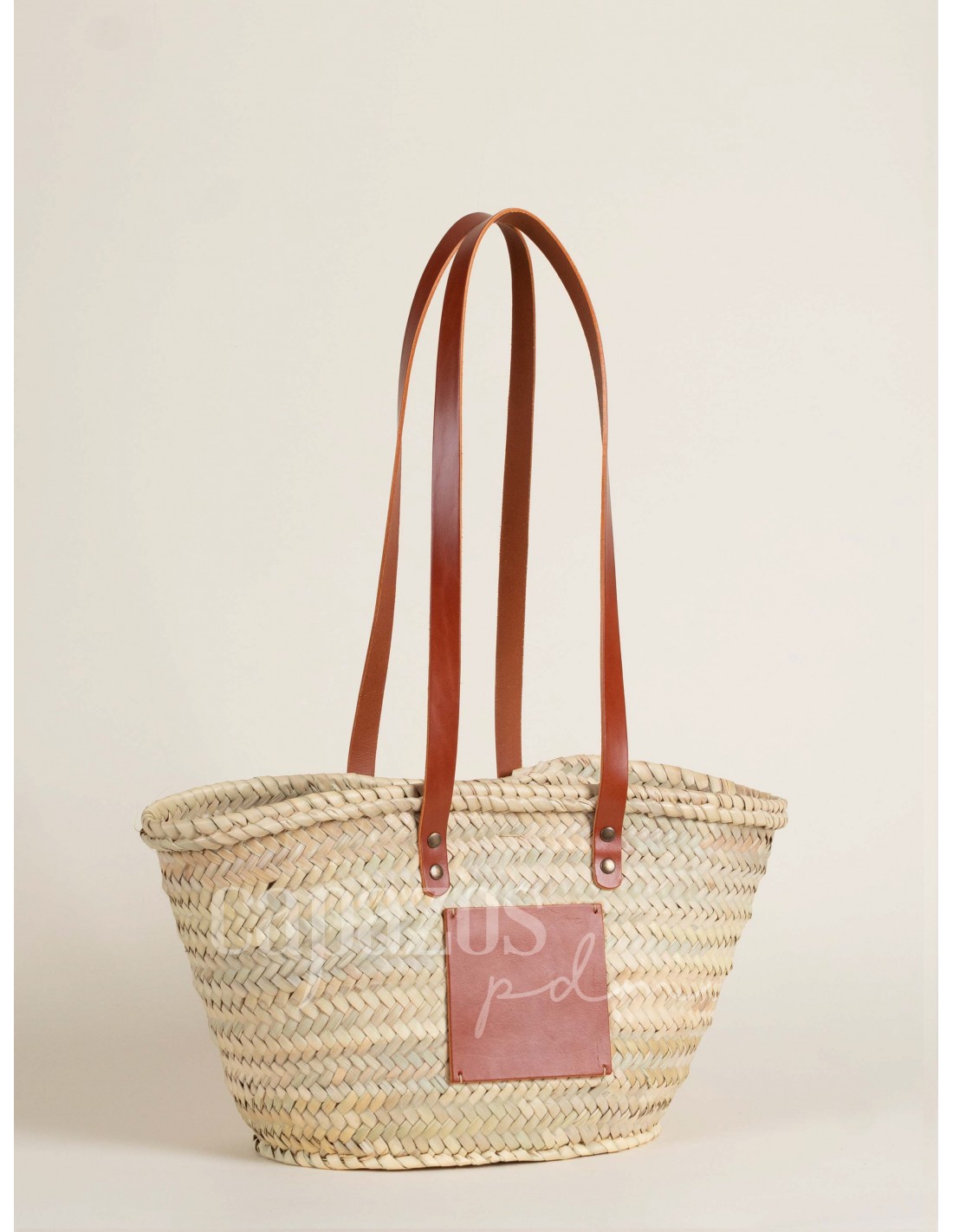 Capazo tejido a mano con palma natural y asas de hombro en piel de vaquetilla, con posibilidad de personalización.