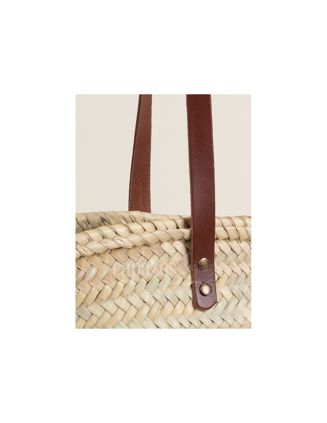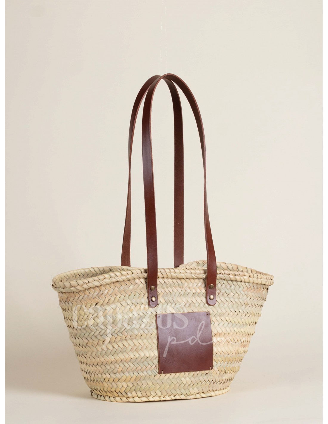 Capazo tejido a mano con palma natural y asas de hombro en piel de vaquetilla, con posibilidad de personalización.