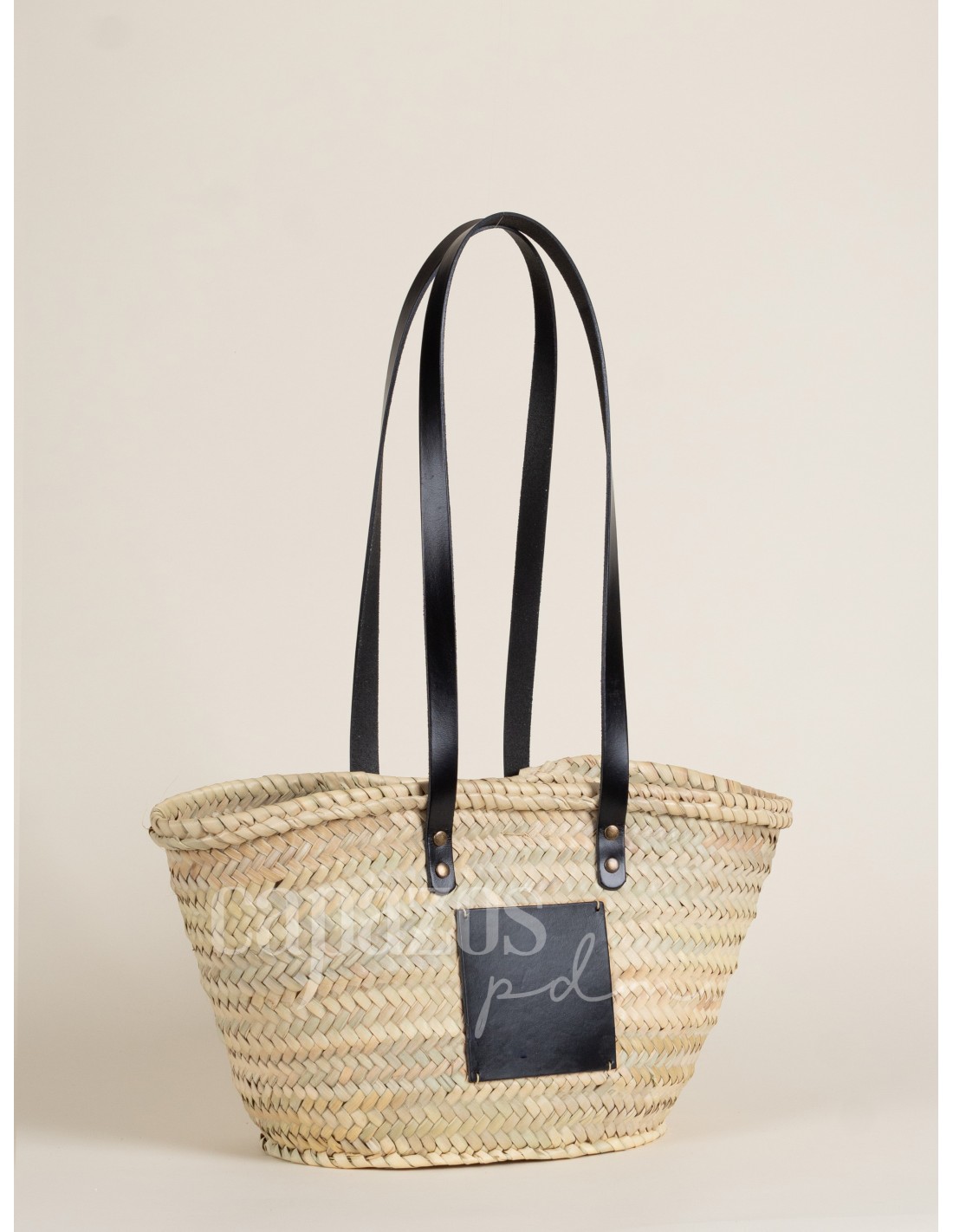 Capazo tejido a mano con palma natural y asas de hombro en piel de vaquetilla, con posibilidad de personalización.