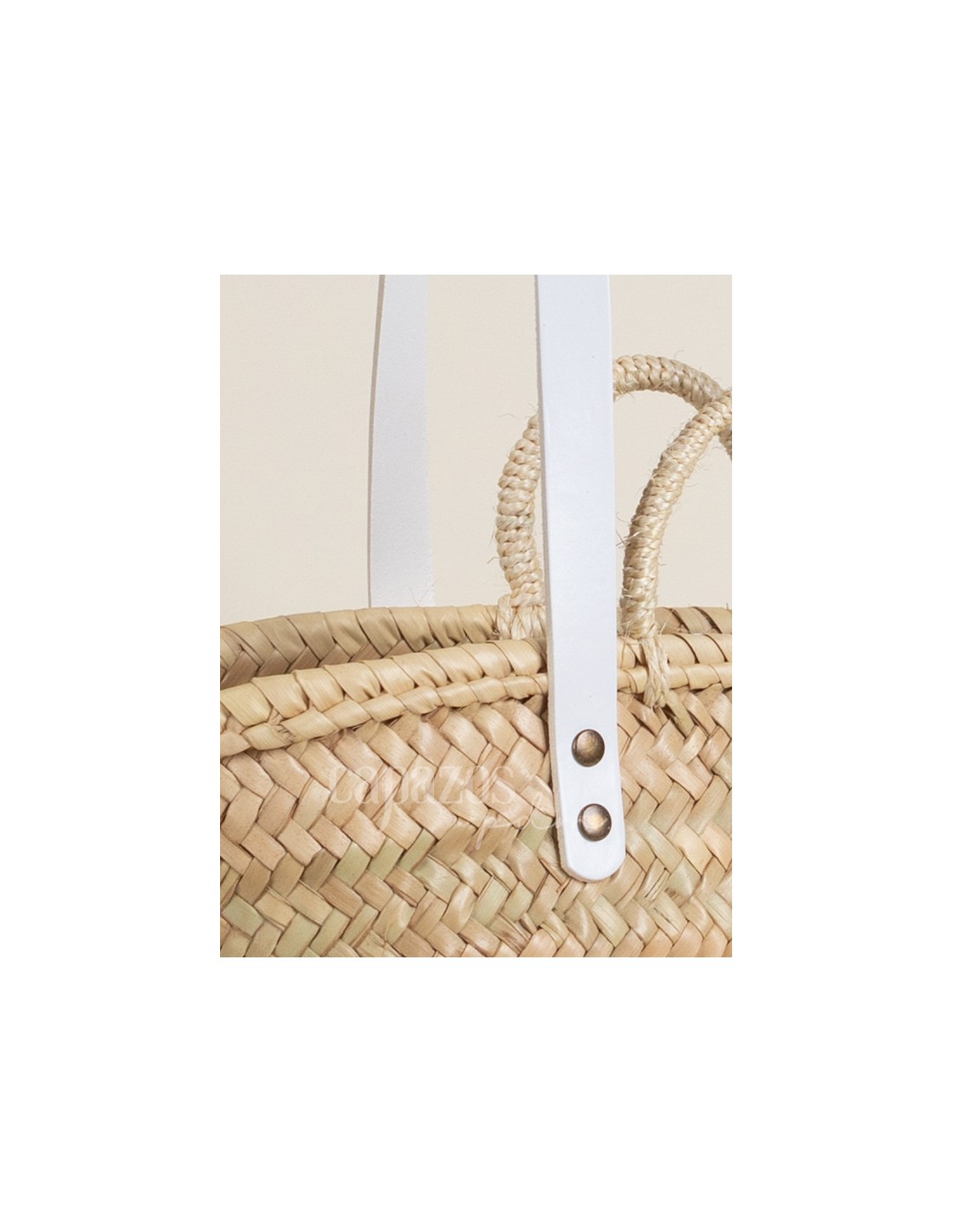 Capazo tejido a mano con palma natural y asas de hombro en piel de vaquetilla y asas de mano de pita de fibra vegetal, con posibilidad de personalización.