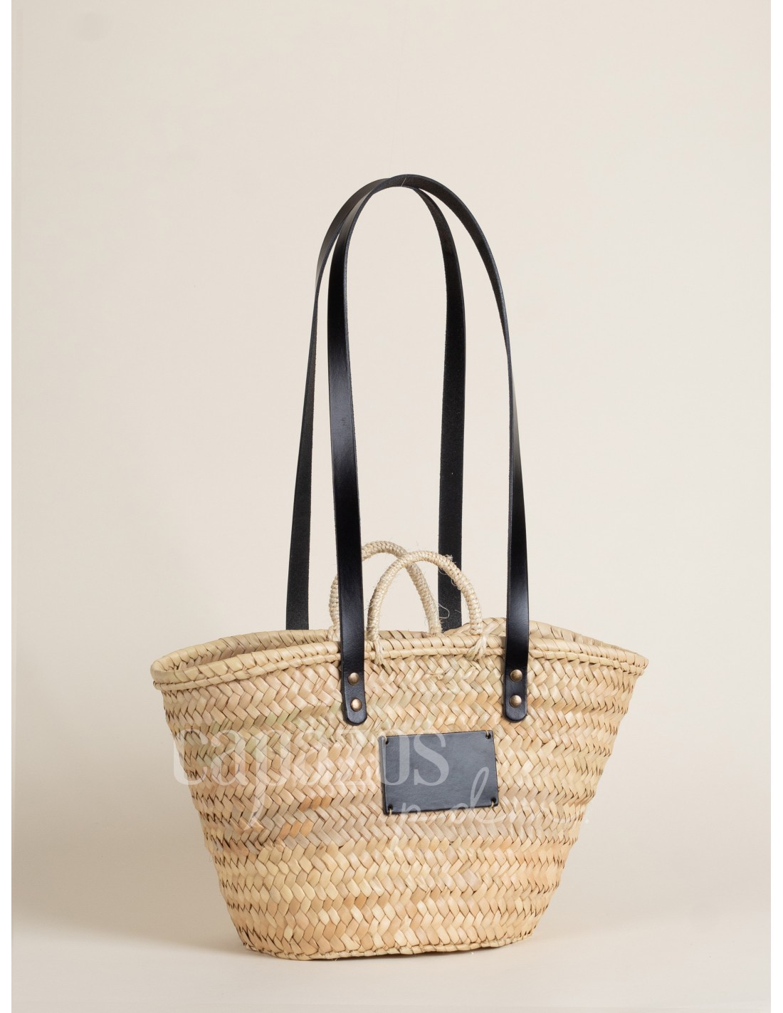 Capazo tejido a mano con palma natural y asas de hombro en piel de vaquetilla y asas de mano de pita de fibra vegetal, con posibilidad de personalización.