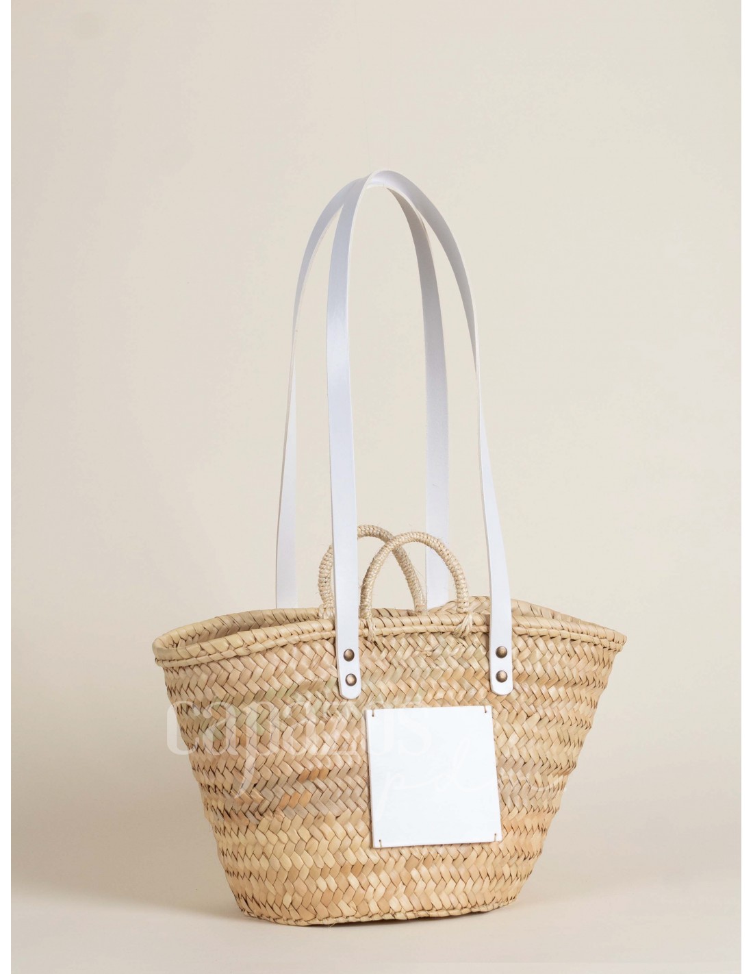 Capazo tejido a mano con palma natural y asas de hombro en piel de vaquetilla y asas de mano de pita de fibra vegetal, con posibilidad de personalización.