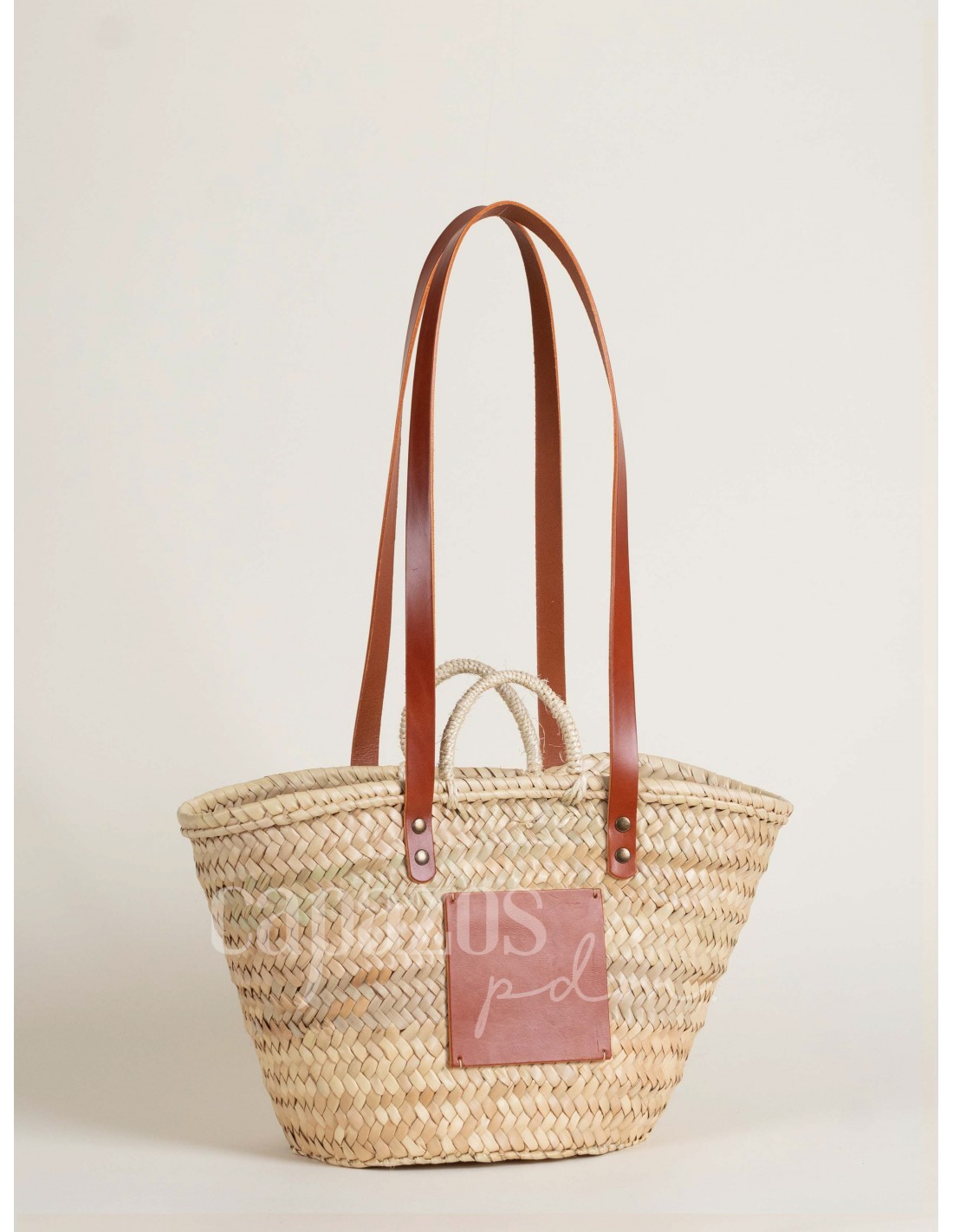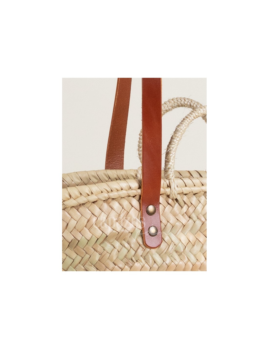 Capazo tejido a mano con palma natural y asas de hombro en piel de vaquetilla y asas de mano de pita de fibra vegetal, con posibilidad de personalización.
