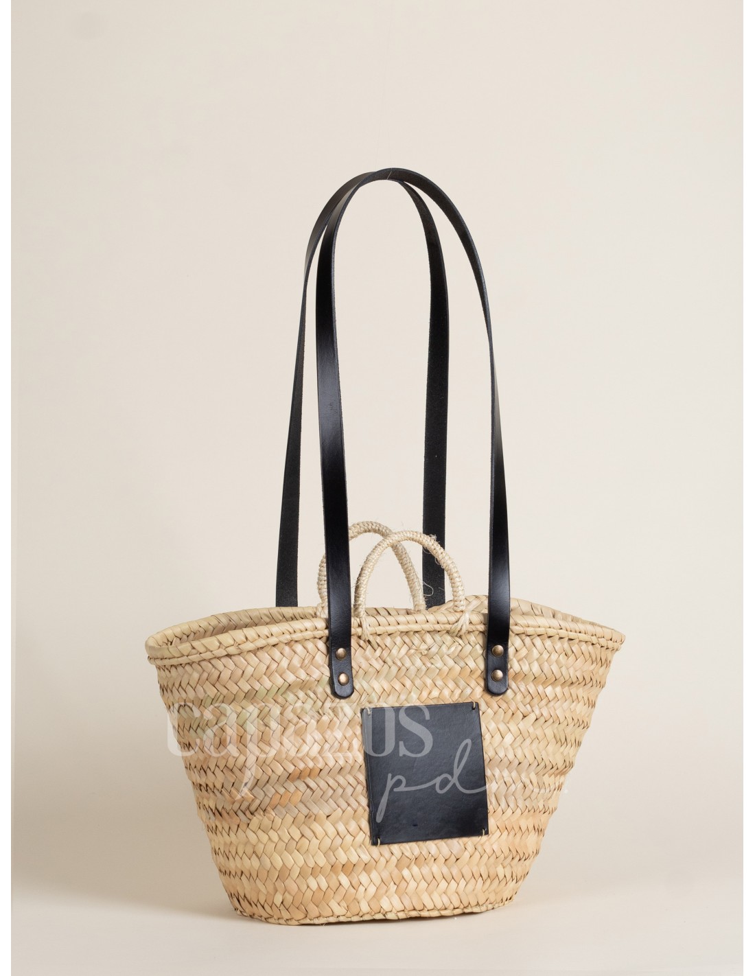 Capazo tejido a mano con palma natural y asas de hombro en piel de vaquetilla y asas de mano de pita de fibra vegetal, con posibilidad de personalización.