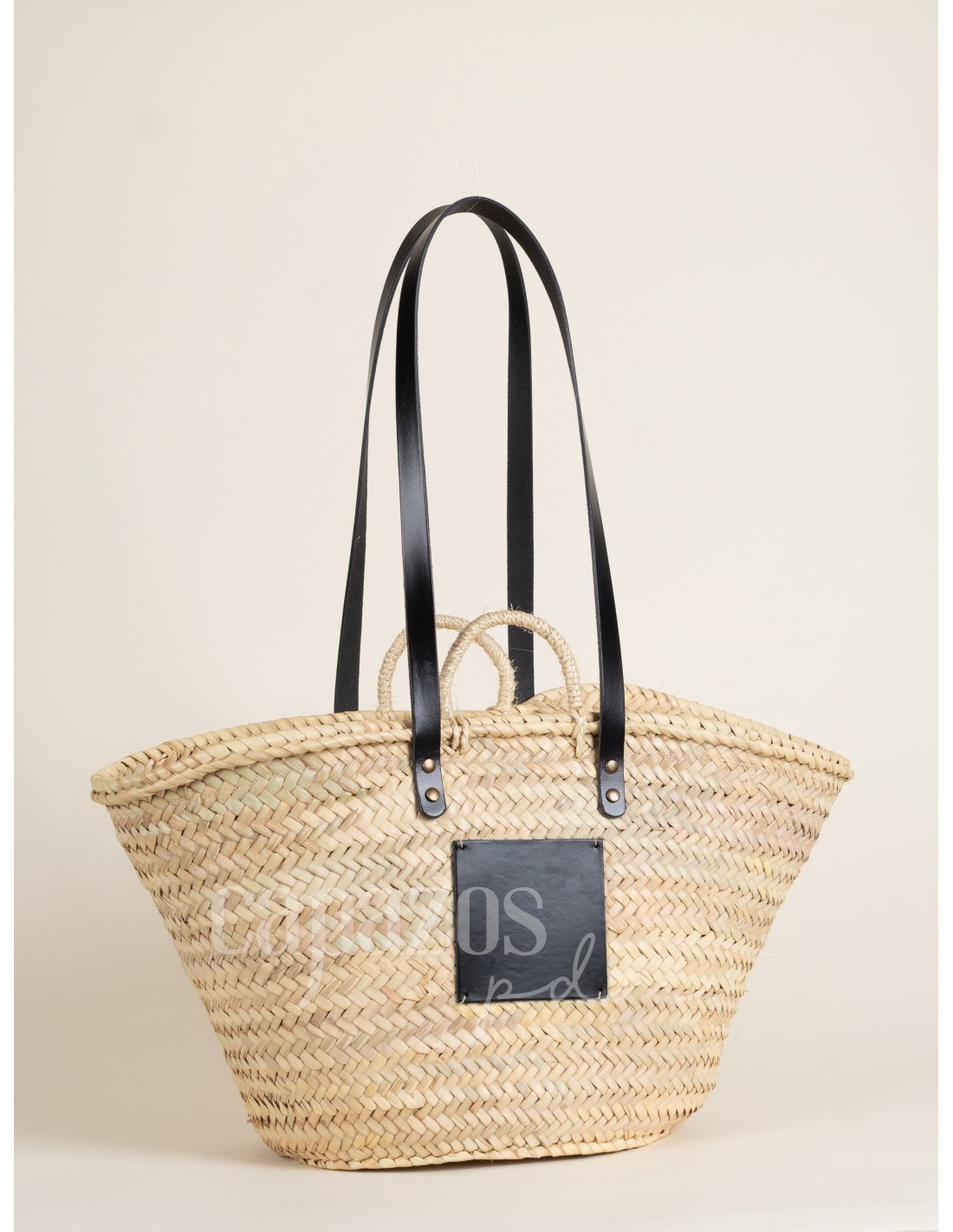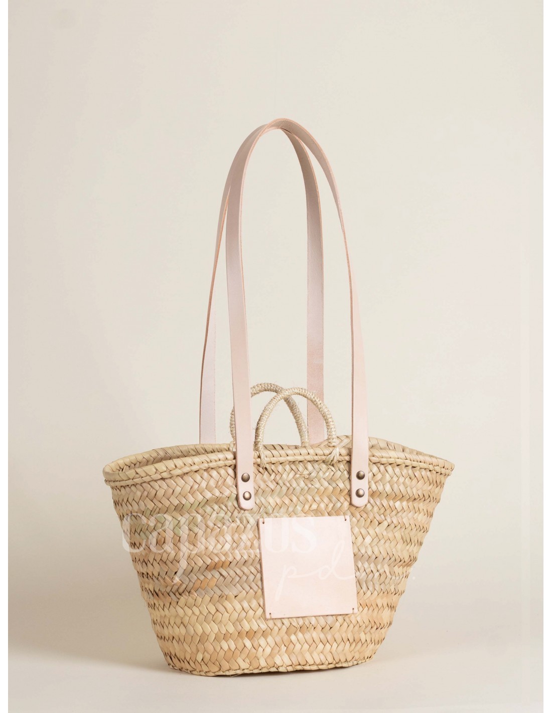 Capazo tejido a mano con palma natural y asas de hombro en piel de vaquetilla y asas de mano de pita de fibra vegetal, con posibilidad de personalización.