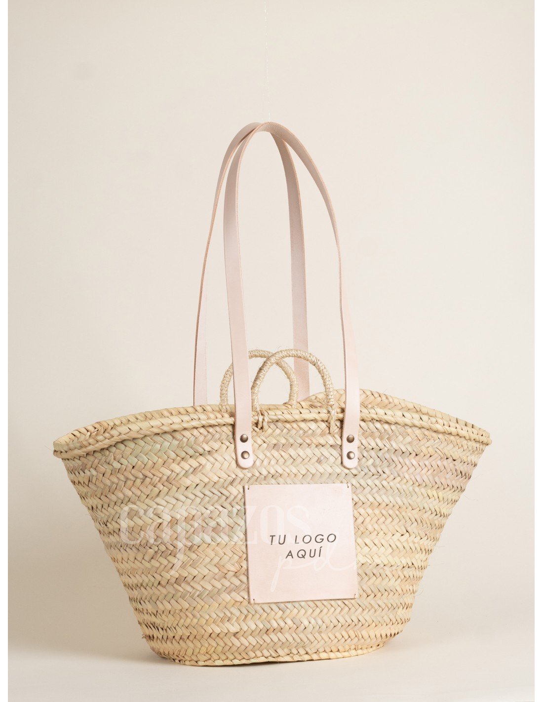 Capazo tejido a mano con palma natural y asas de hombro en piel de vaquetilla y asas de mano de pita de fibra vegetal, con posibilidad de personalización.