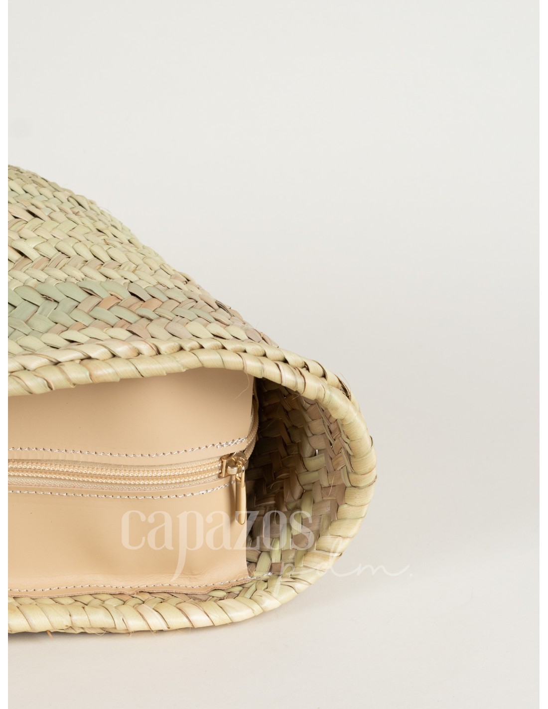 Capazo cerrado con cremallera, tejido con palma natural, asa de pita y asa de cruzar en piel con hebilla para regular, con posibilidad de personalización.