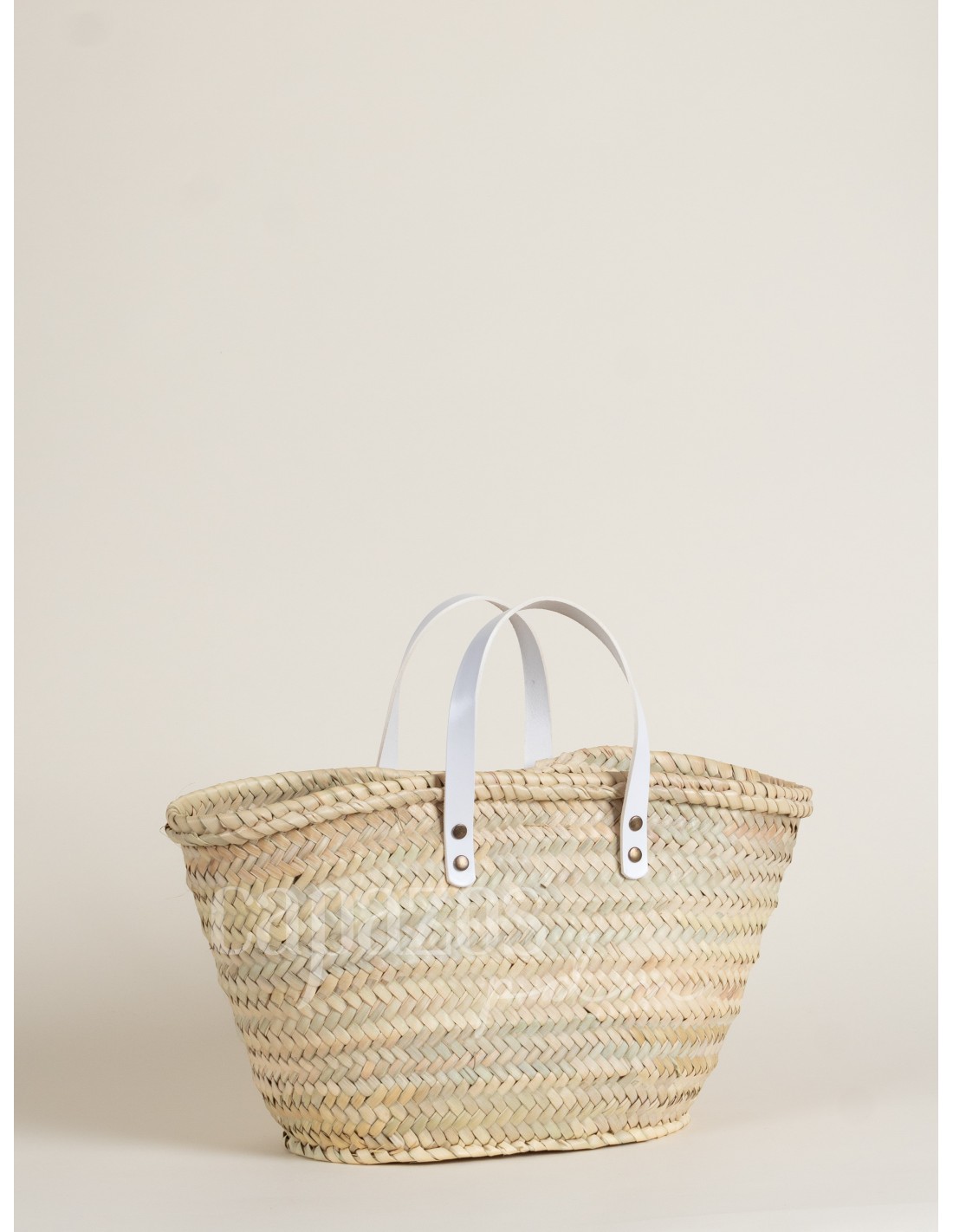 Capazo tejido a mano con palma natural y asas de mano en piel de vaquetilla. Las asas son de 40x1.7 cm.