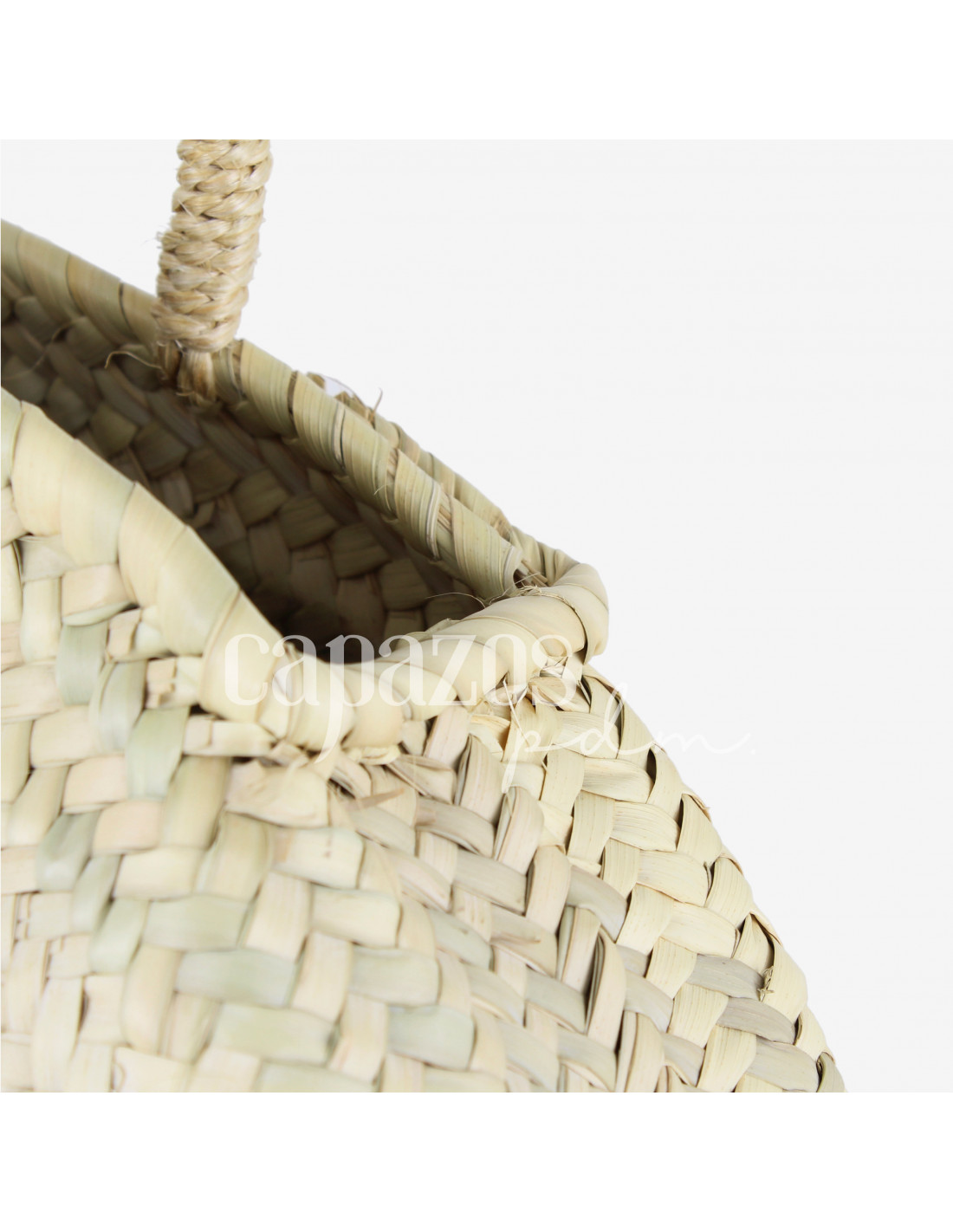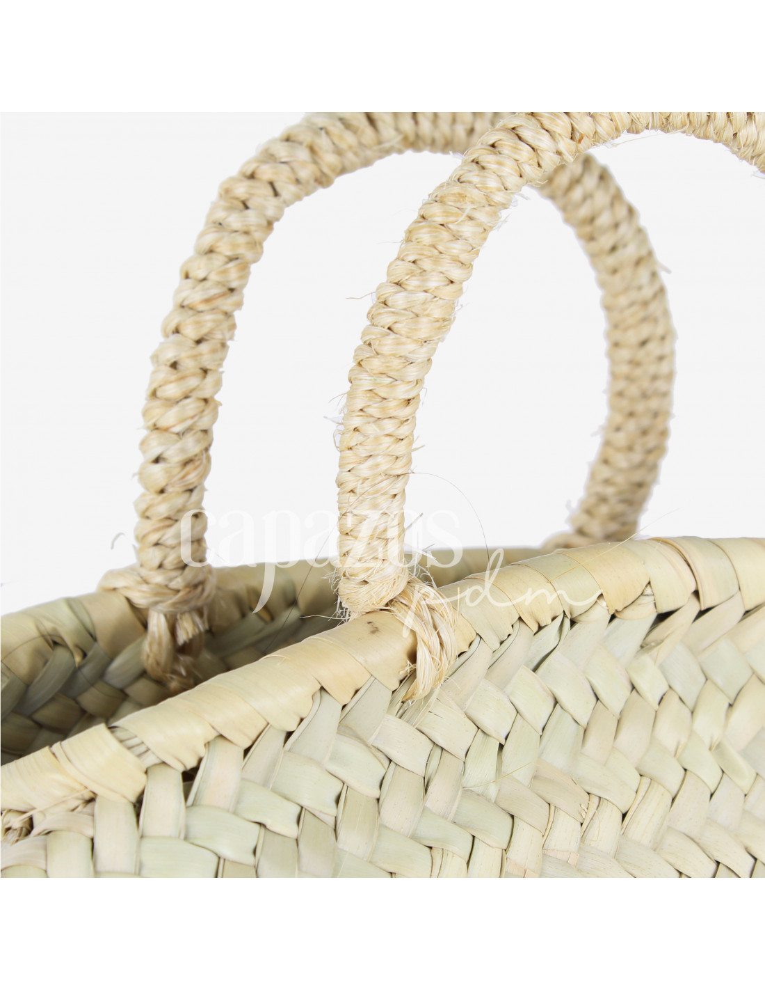 Capazo con forma ovalada tejido a mano con palma natural y asas de pita de fibra vegetal. PACK 25 UNIDADES.